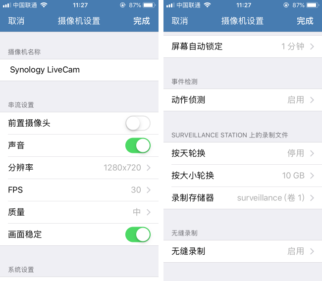 當(dāng)然首先要做的就是在群暉的套件中心下載 Surveillance Station 這個(gè)套件,這個(gè)可以看作是監(jiān)控的基礎(chǔ)軟件。安裝完成之后在你的舊手機(jī)上安裝 LiveCam,輸入你的 QuickConnect ID 以及用戶名和密碼,點(diǎn)擊下方錄制監(jiān)控就正式開始了!對,現(xiàn)在你已經(jīng)完成了通過舊手機(jī)實(shí)現(xiàn)的家中視頻監(jiān)控了!