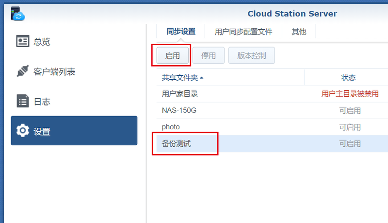 2、在Cloud Station Server中,設置,啟用新建的“備份測試”共享文件夾;