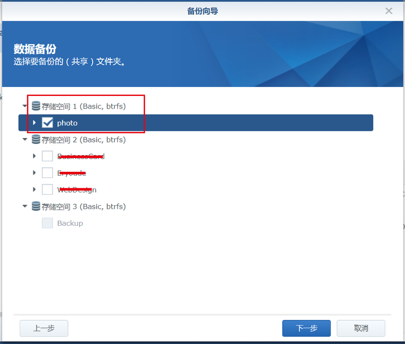 4、下一步,數(shù)據(jù)備份,選擇要備份的共享文件夾。勾選photo文件夾(即硬盤1中需要備份的文件),即將硬盤1中的photo文件備份至硬盤2中。