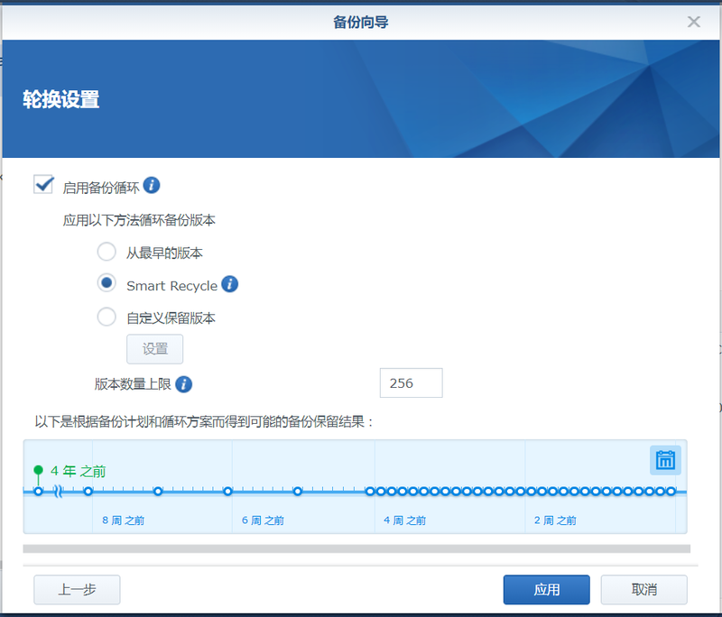 6、輪換設(shè)置,可以啟用備份循環(huán)或者不啟用。啟用后會保存一定數(shù)據(jù)的版本,如圖設(shè)置為256個版本,但同時也會增加備份文件占用空間。