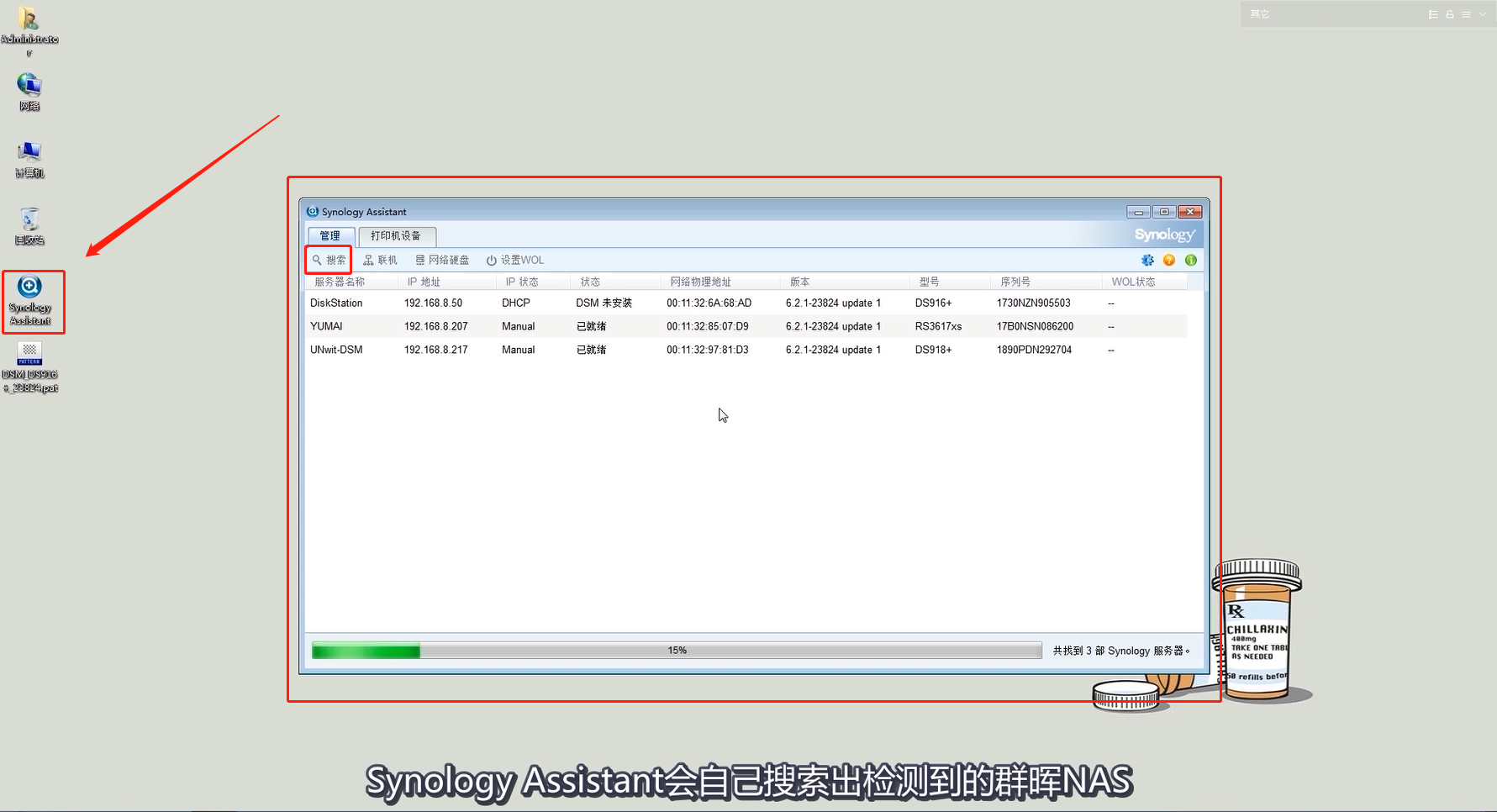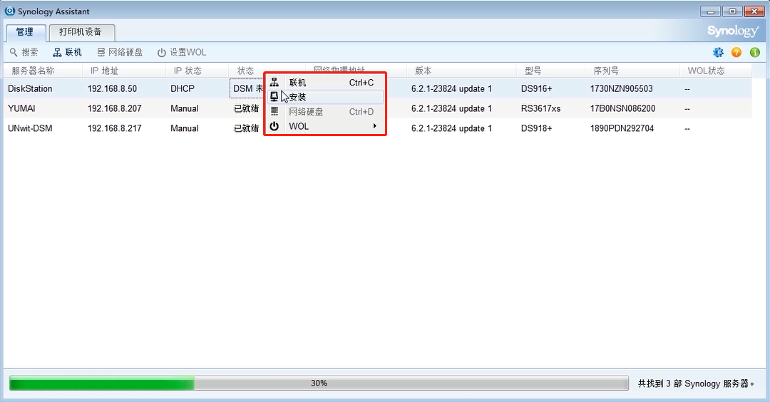 先按照平時安裝新軟件,安裝好群暉 Synology Assistant 之后,打開 Synology Assistant 軟件掃描同網(wǎng)絡(luò)內(nèi)的群暉 NAS網(wǎng)絡(luò)存儲設(shè)備。