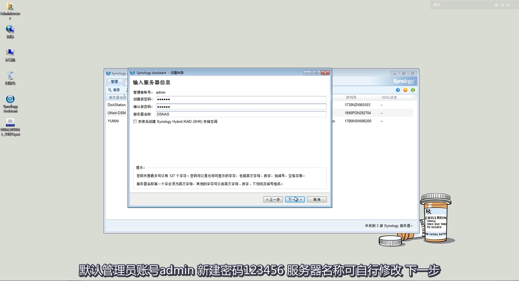 下一步,輸入管理員的密碼,可以根據(jù)自己需要修改服務(wù)器名稱,這里不改后面也可以在系統(tǒng)里面修改。先不要勾選安裝后創(chuàng)建 Synology Hybrid RAID (SHR)存儲空間,太耗費時間,有些用戶需要用 RAID 5或者其他陣列。