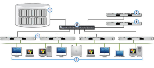 采用8Gb光纖網(wǎng)絡(luò),存儲(chǔ)采用的Gisdom 1682 8Gb光纖盤陣,兩臺(tái)OS X Server元數(shù)據(jù)服務(wù)器。